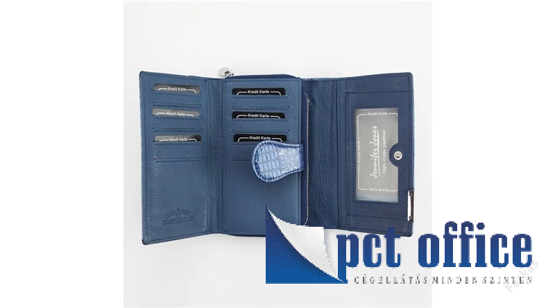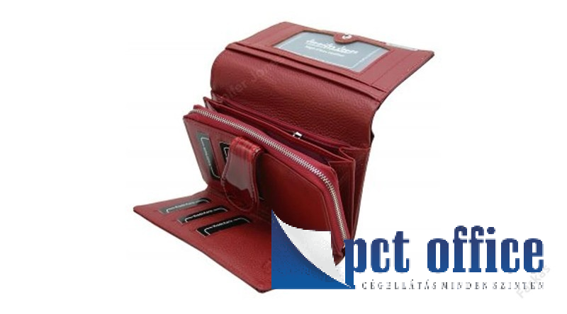 Közepes méretű, divatos női pénztárca. Fedele patenttal nyitható. Belsejében két rekeszes papírpénztartó, egy cipzárral nyíló, két rekeszes aprópénztartó, egy cipzáras zseb illetve egy patentos átkapcsolóval nyíló kártyatartó rész található. Összesen 12 db kártyát és 5 igazolványt is elhelyezhetünk. Hátulján egy további nagy méretű zseb van. Kívül lakkbőrből, belül bőrből készült.