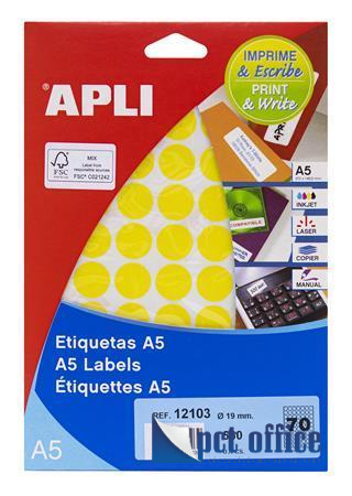 Etikett, 19 mm kör, színes, A5 hordozón, APLI, sárga, 560 etikett/csomag