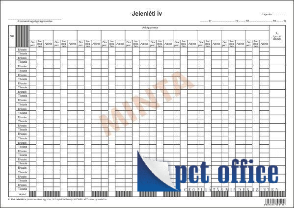 Jelenléti ív: (óraösszesítéssel egy hónapra, 10 fő nyilvántartására), A/3, 420x295 mm, fekvő.
