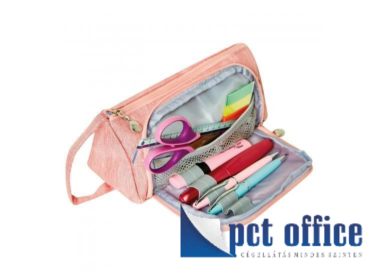 Üres tolltartó Homeoffice rose, 22 x 10,5 x 9 cm-es méretben, tágas tárolórekesz 2 belső zsebbel, 1 első zseb hálós rekesszel és tolltartó gumipántokkal.